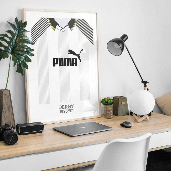 Looking for the perfect Derby gift? Look no further! Add some football charm to your room with our Derby 1995 Retro kit poster. Printed on premium paper, order with or without a frame and easily incorporate it into any room in your home or office. Perfect gift for Derby enthusiasts!