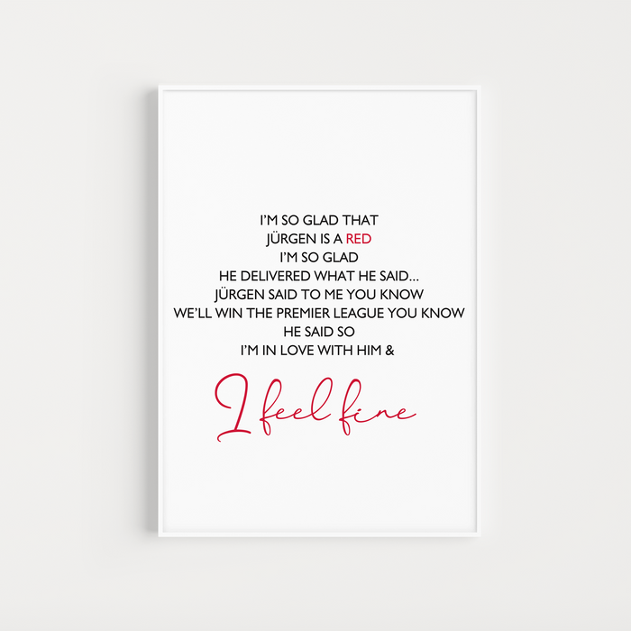 Add some football charm to your room with our Liverpool '"Jurgen Is A Red"' lyrics poster! This striking design celebrates Liverpool's iconic chant. Printed on premium 240gsm satin photo paper, order with or without a frame and easily incorporate it into any room in your home or office. Perfect gift for birthdays, Father's Day, or Christmas.