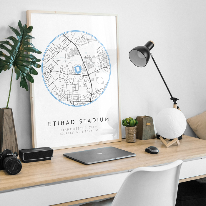 Looking for the perfect Man City gift? Look no further! Our Etihad Stadium Map Poster. Printed on premium paper, order with or without a frame and easily incorporate it into any room in your home or office. Perfect gift for an Man City fan!